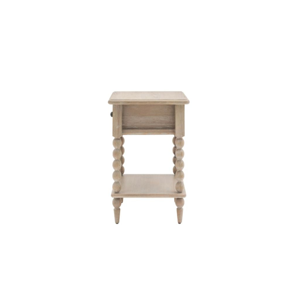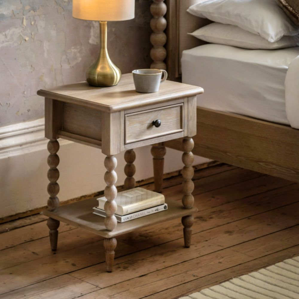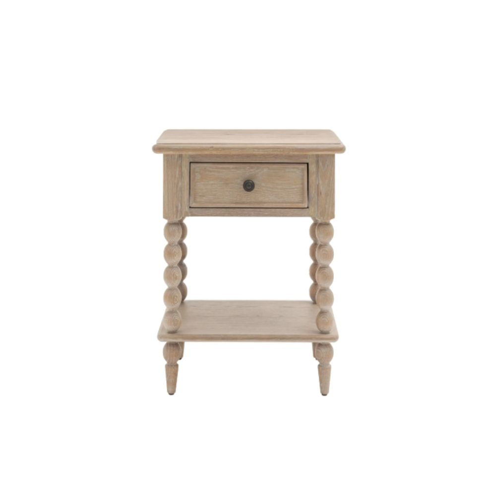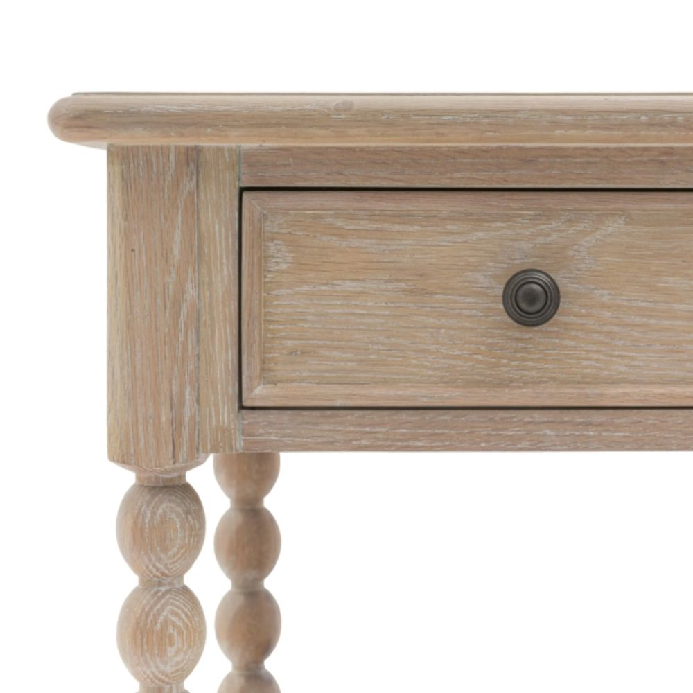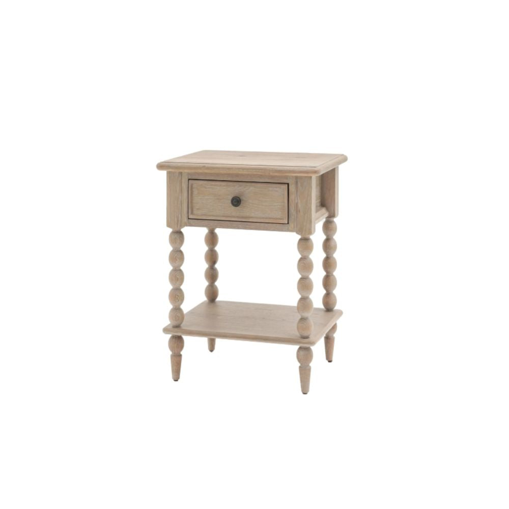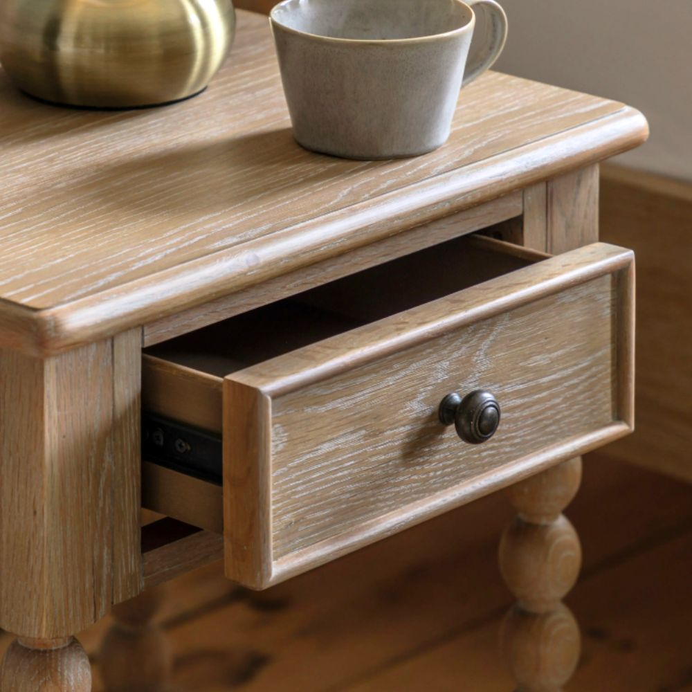 Cette table de chevet raffinée à un tiroir allie savoir-faire artisanal et élégance pratique. Les détails soignés de la bobine tournée à la main témoignent d'une tradition d'ébénisterie d'exception, tandis que sa construction en chêne massif garantit une qualité durable. Sa finition blanchie à la chaux lui confère une patine naturelle délicate qui s'harmonise avec tous les styles d'intérieur. Le tiroir astucieusement intégré offre un espace de rangement discret, faisant de ce meuble sophistiqué un compagnon idéal pour les propriétaires exigeants.