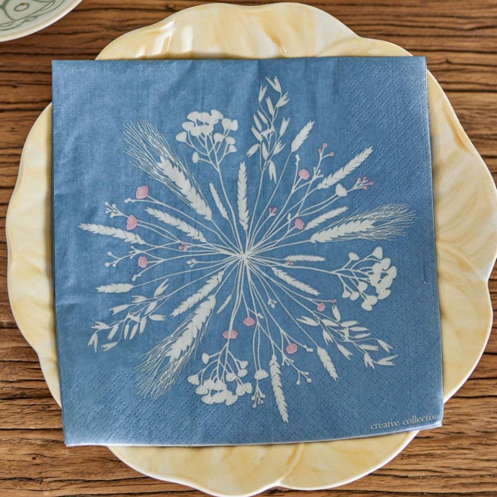 Ornée d'un imprimé botanique rose pâle et chaleureux sur un fond bleu luxueux, cette nappe sublimera votre table d'une élégante touche de nature.