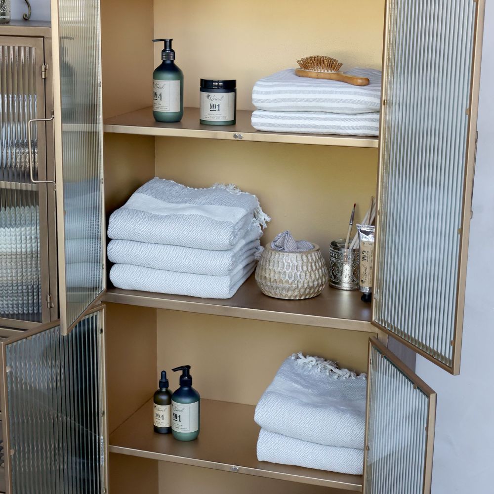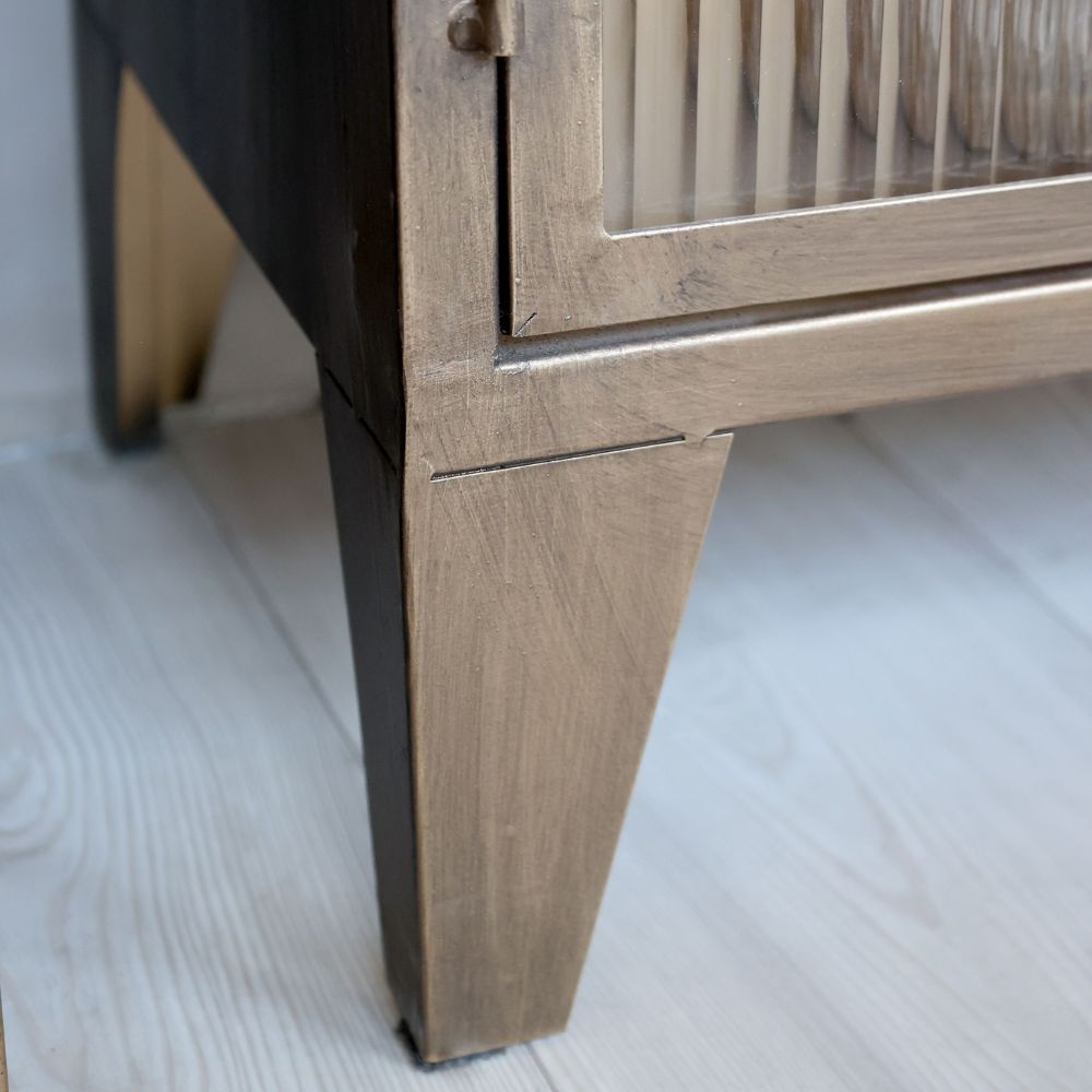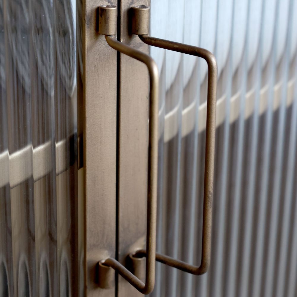 La vitrine Cornelius allie laiton antique et fer pour un style vintage et résistant. Ses portes en verre cannelé mettent en valeur vos objets tout en apportant une touche d'élégance texturée, sublimant ainsi la décoration de n'importe quelle pièce. Idéale pour exposer vos objets préférés ou des éléments décoratifs avec une note raffinée.