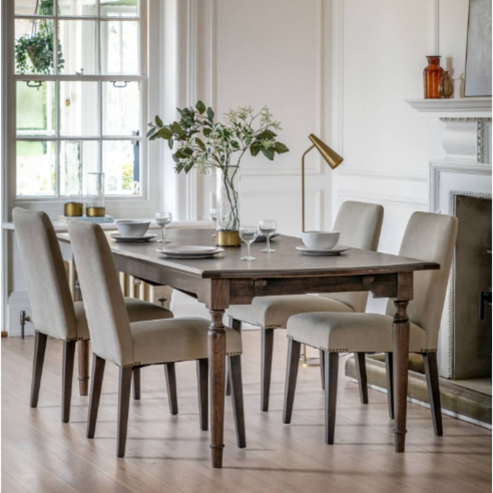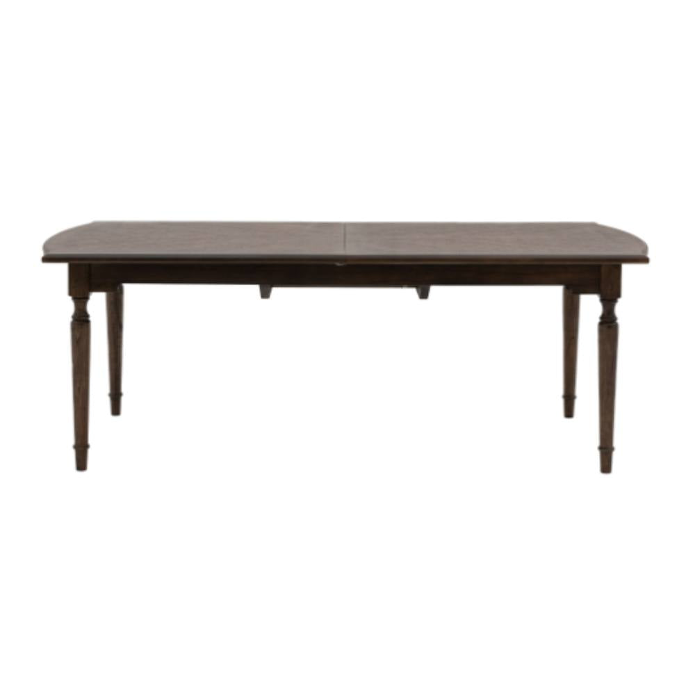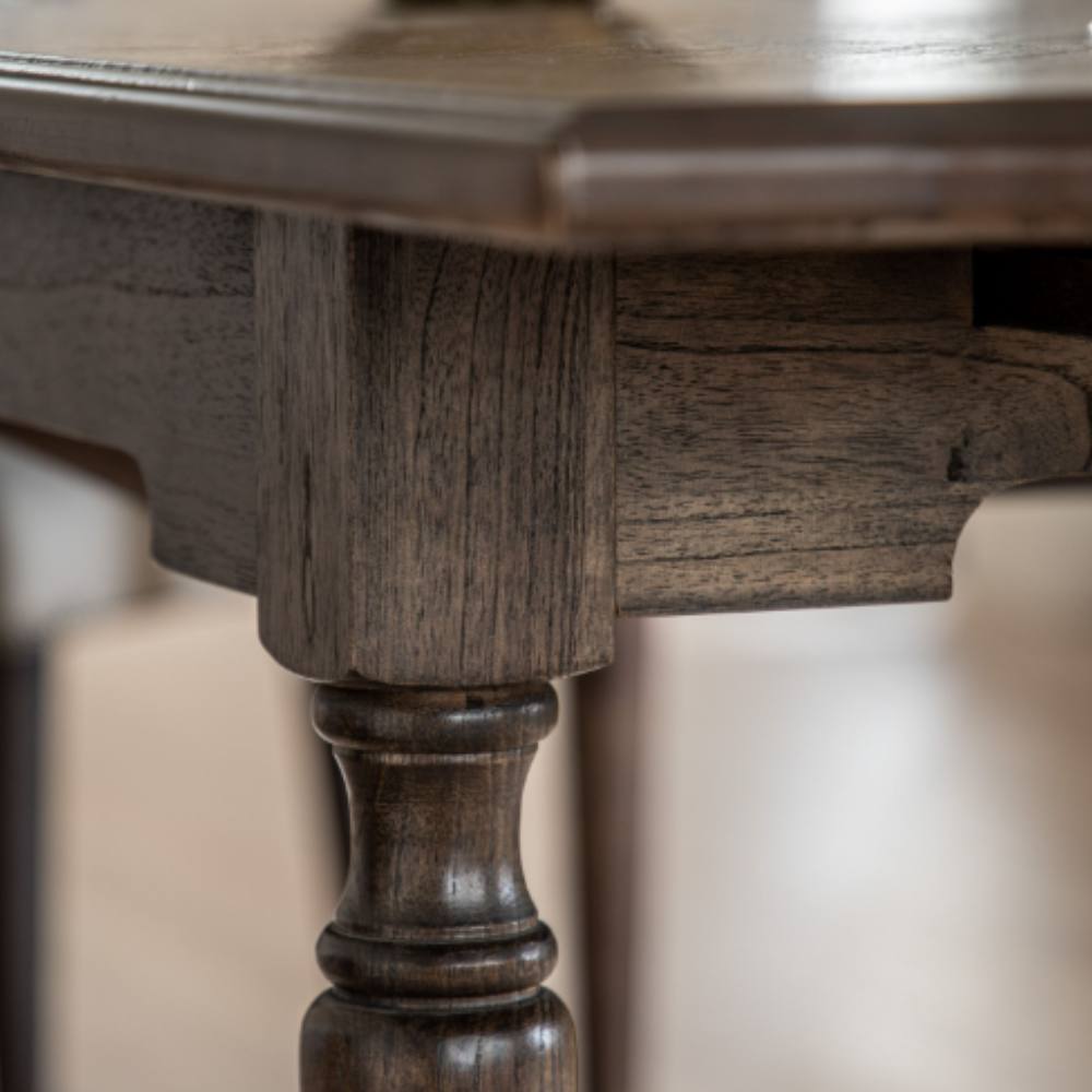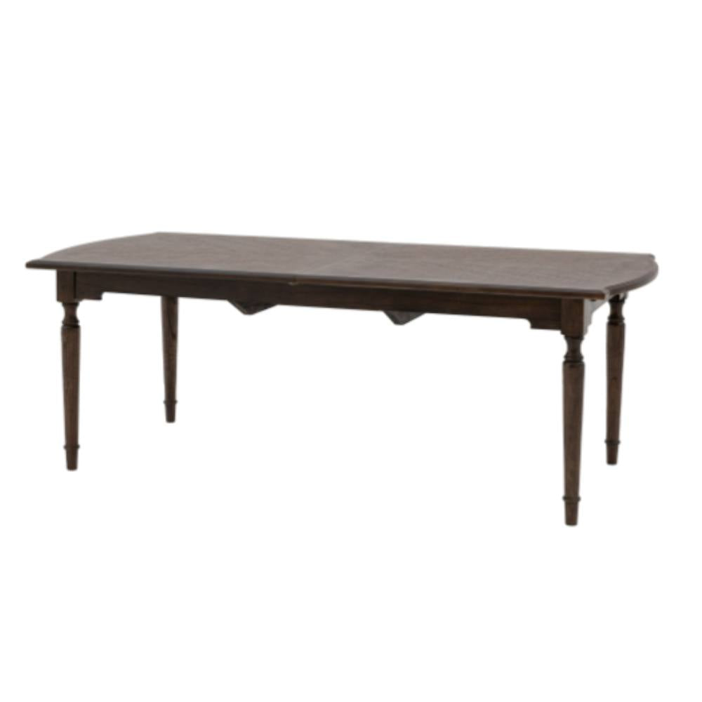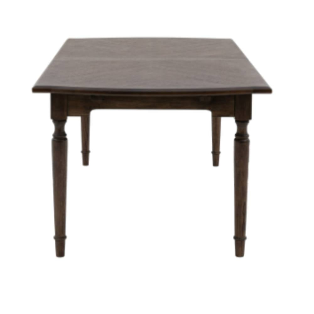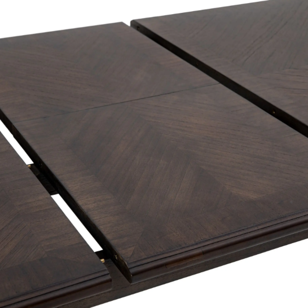 Sublimez vos repas avec la table extensible Madison. Son design intemporel et raffiné se distingue par ses superbes placages et marqueteries en bois de mindy foncé, couleur café, reposant sur des pieds fuselés en bois de mindy massif, évoquant un luxe raffiné. Ses rallonges papillon centrales permettent d'accueillir jusqu'à dix convives, créant ainsi le cadre idéal pour une soirée d'exception.