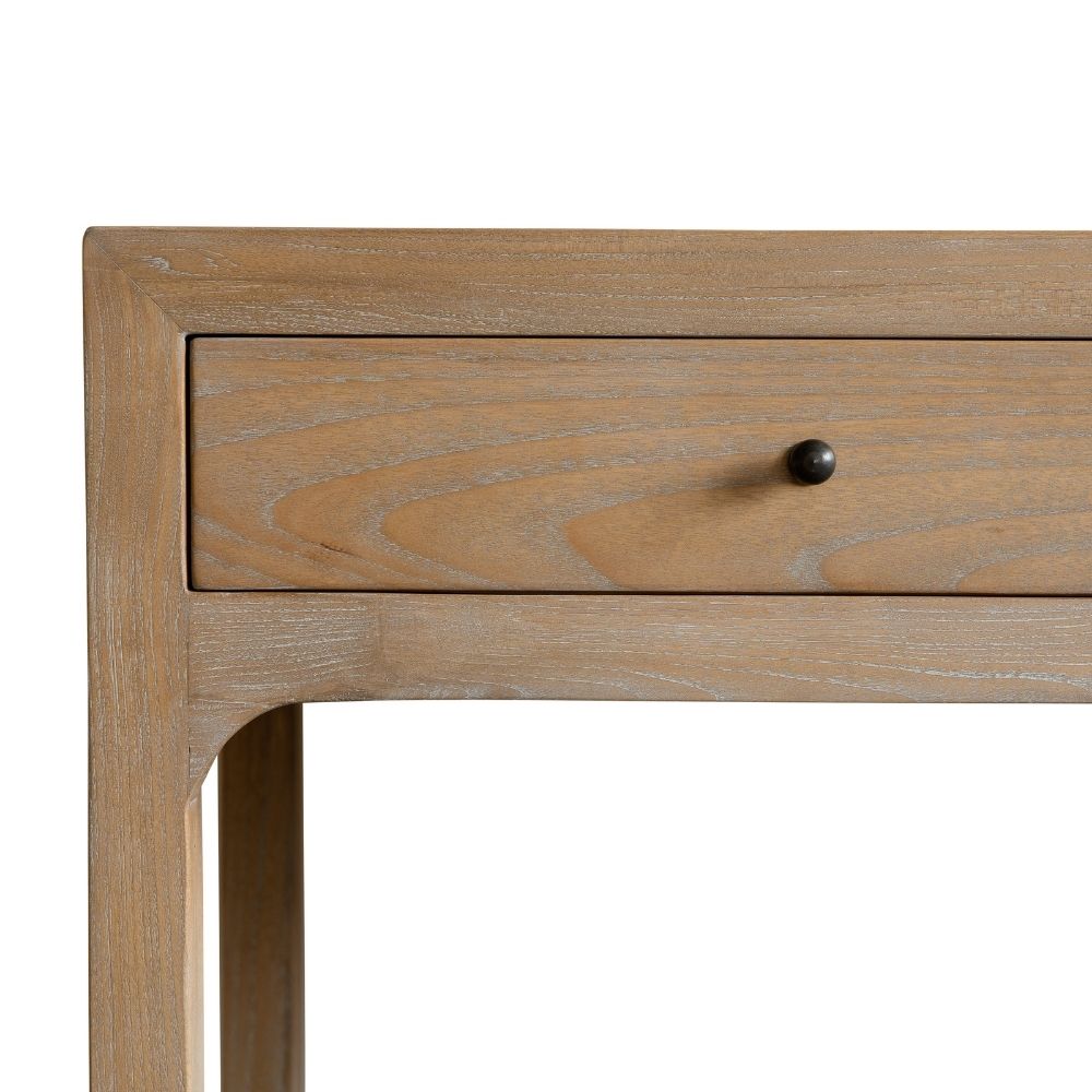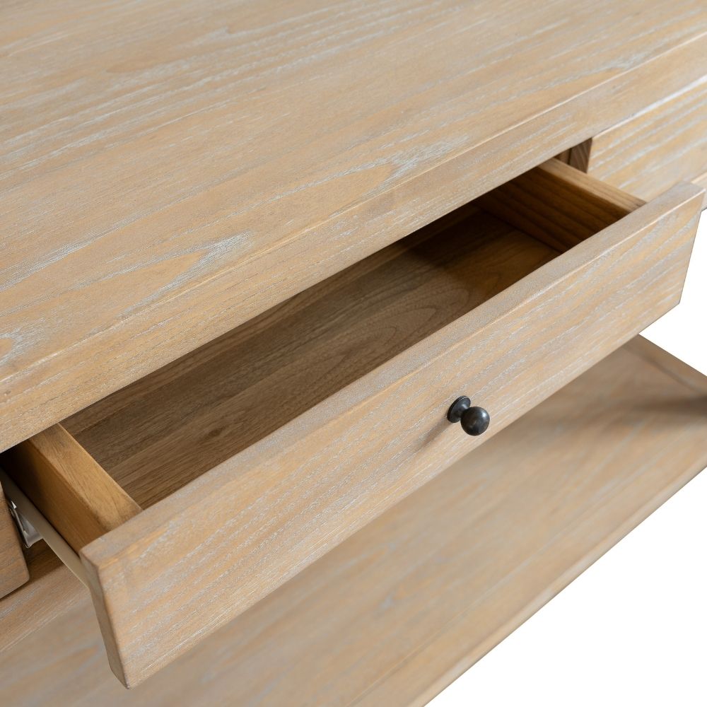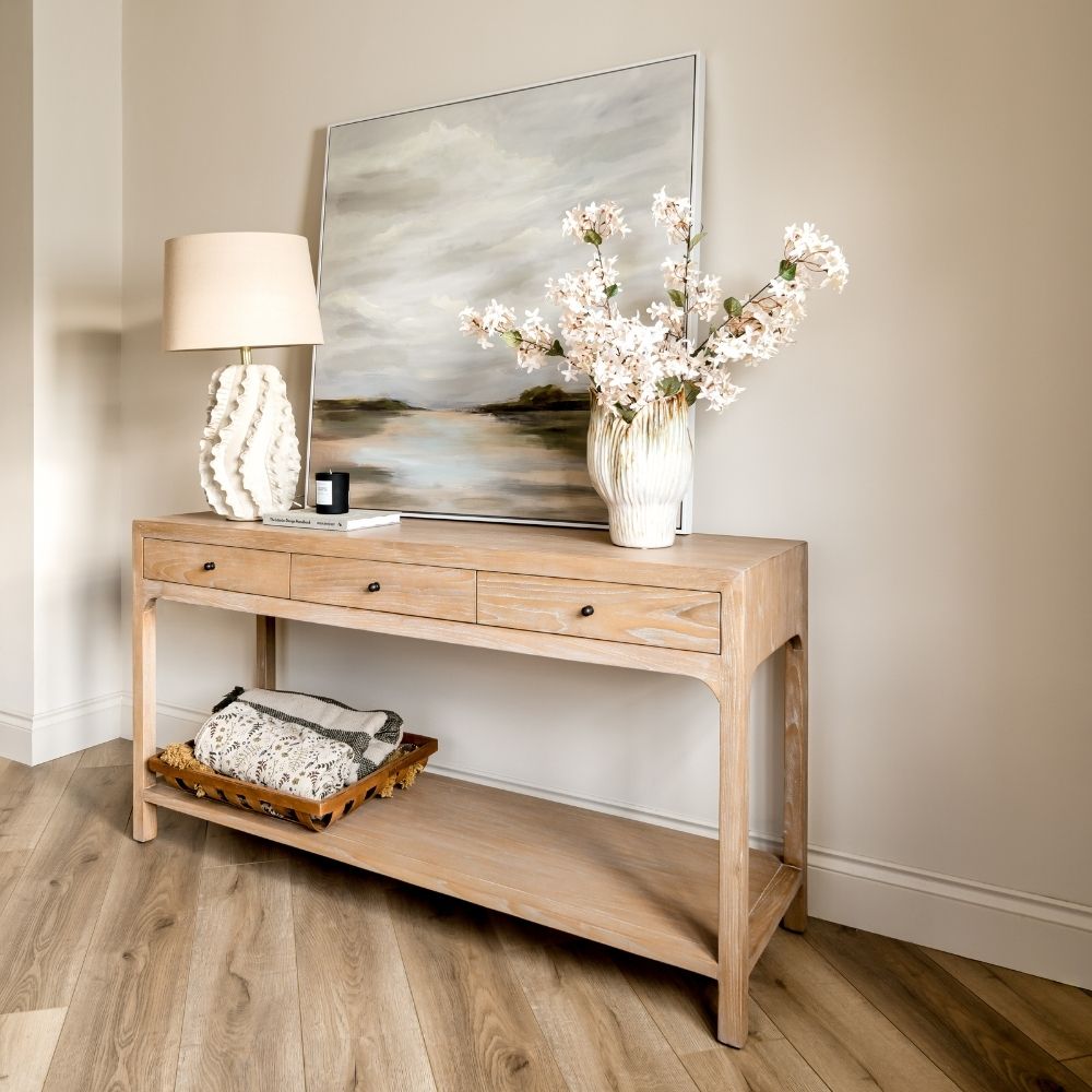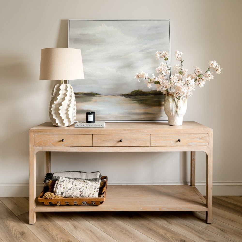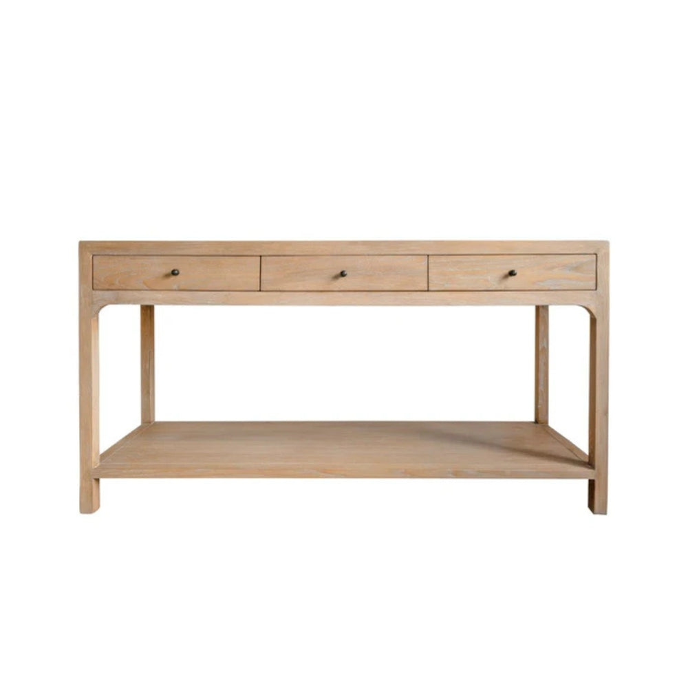 Fabriquée avec soin en chêne indonésien, la console Mariella à 3 tiroirs allie style et fonctionnalité dans tous les espaces. Sa finition gris ciel élégante s'harmonise avec tous les décors, tandis que ses trois tiroirs spacieux et son étagère inférieure offrent un grand espace de rangement. Un meuble indispensable pour toute maison.