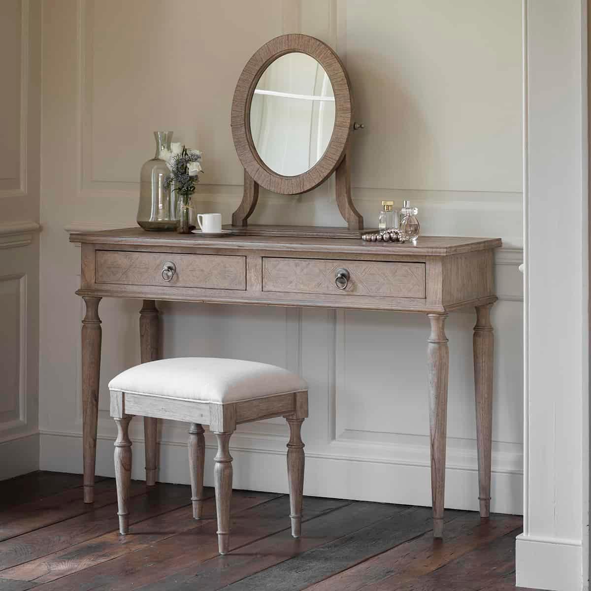 Vous cherchez une nouvelle coiffeuse élégante et fonctionnelle pour votre chambre ? La coiffeuse Mustique est idéale pour les adeptes du style classique français. Fabriquée en frêne massif et robuste, elle dispose de deux tiroirs spacieux pour ranger tous vos produits de maquillage. De simples poignées anneaux ajoutent une touche de luxe. Son grand plan de travail rectangulaire offre un espace généreux pour se préparer chaque matin. Un miroir ovale assorti, élégamment fixé sur des supports incurvés au-dessus de la coiffeuse, est à la hauteur idéale pour une utilisation confortable en position assise et pivote pour plus de facilité.