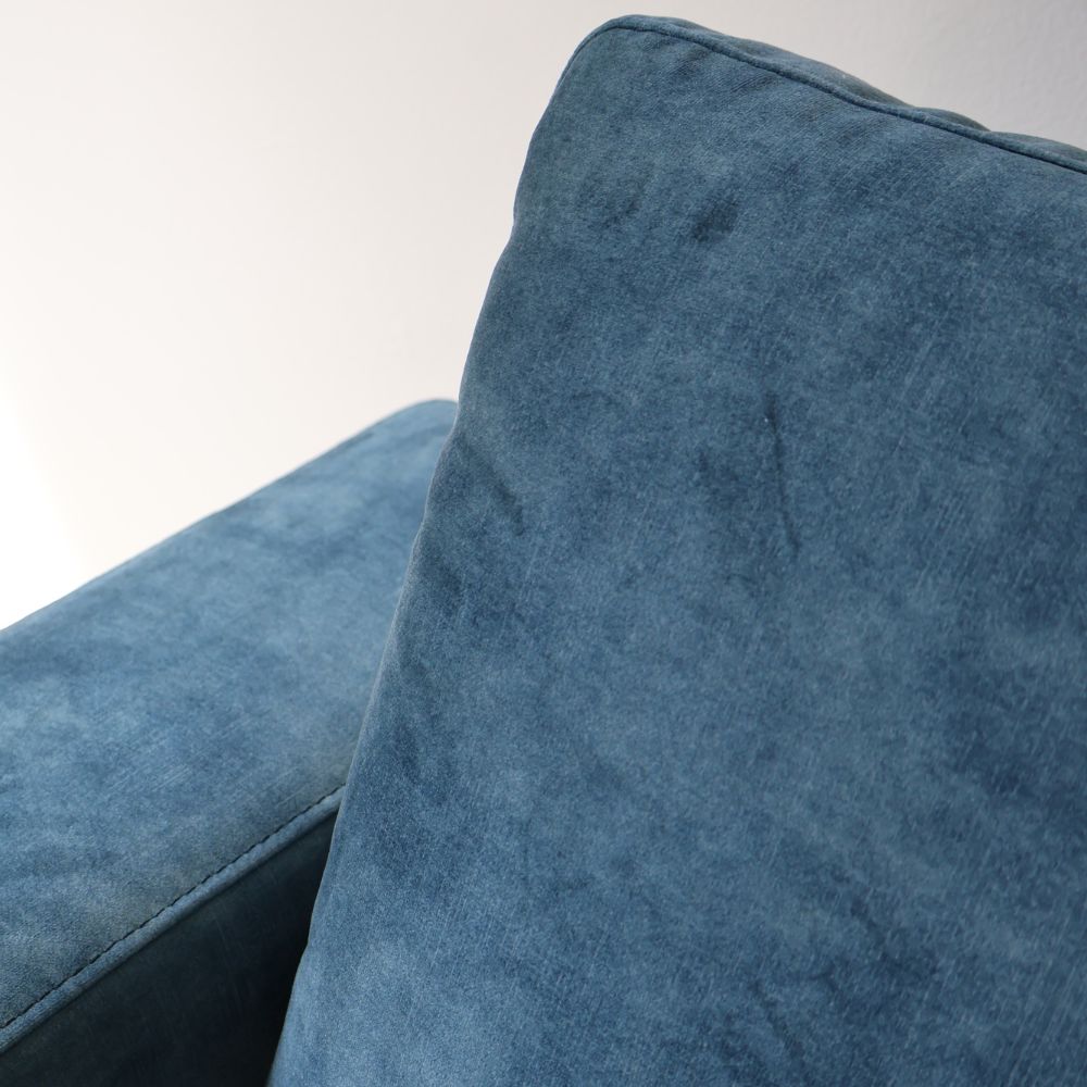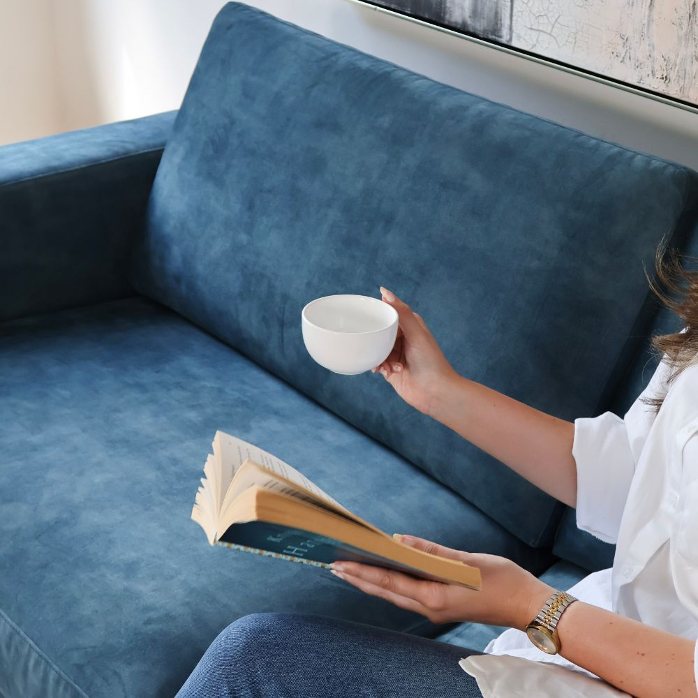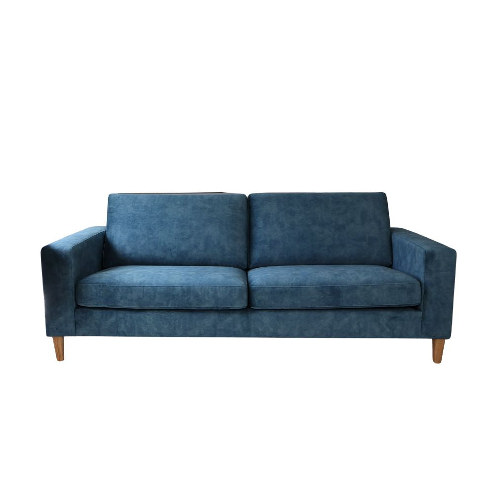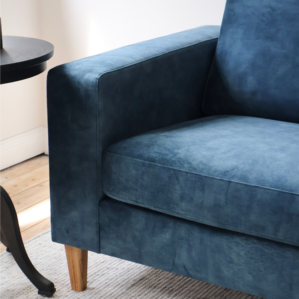 Ce canapé est revêtu d'un velours bleu profond, doux et résistant, qui sublime son charme irrésistible. Sa texture luxueuse lui confère une douce luminosité et une élégance raffinée, en faisant la pièce maîtresse idéale d'un salon moderne et sophistiqué. Alliant confort et style, il rehausse l'atmosphère de votre intérieur en toute simplicité.