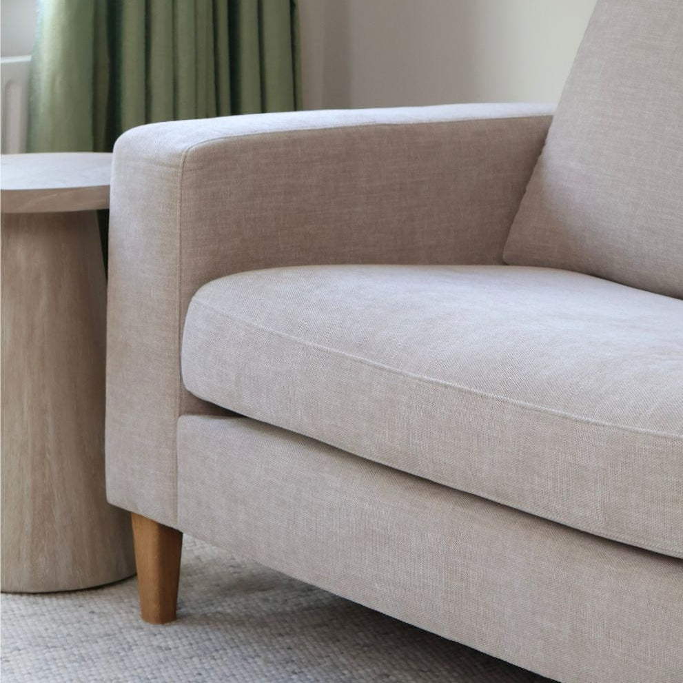 Tissu beige clair à la texture riche et au confort optimal. Ce canapé est idéal pour les adeptes du style scandinave qui apprécient les matériaux naturels, un design épuré et la fonctionnalité. Revêtu d'un tissu d'inspiration scandinave, il apporte une ambiance apaisante et chaleureuse à votre intérieur.