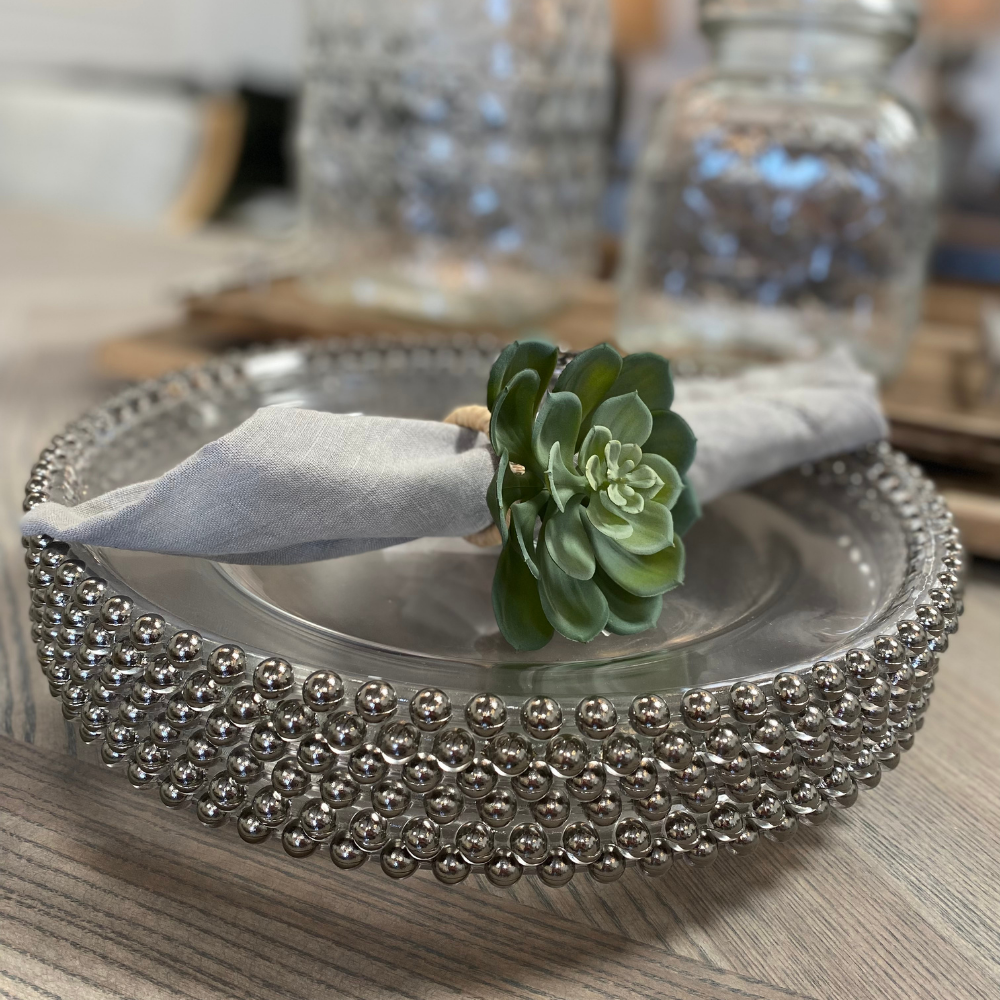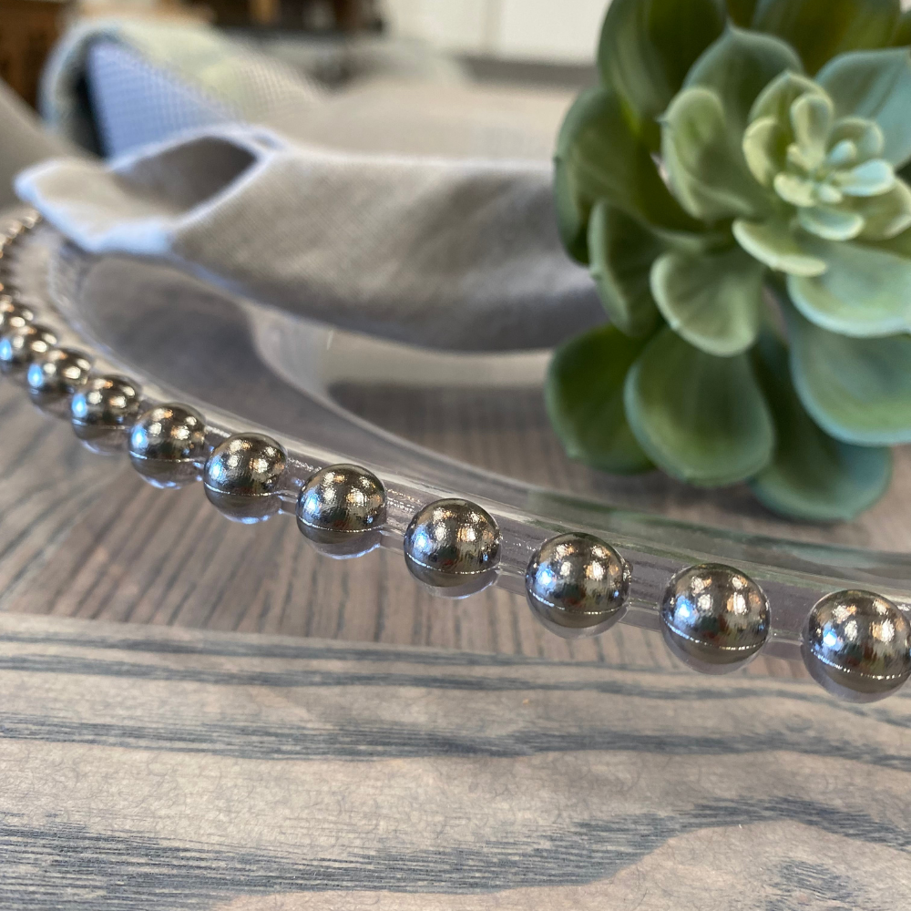 Assiette en verre à perles argentées