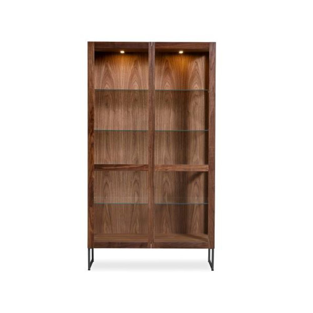 - Deux portes vitrées, quatre étagères en verre et deux lampes LED ; peut être posé sur un socle ou sur des pieds.