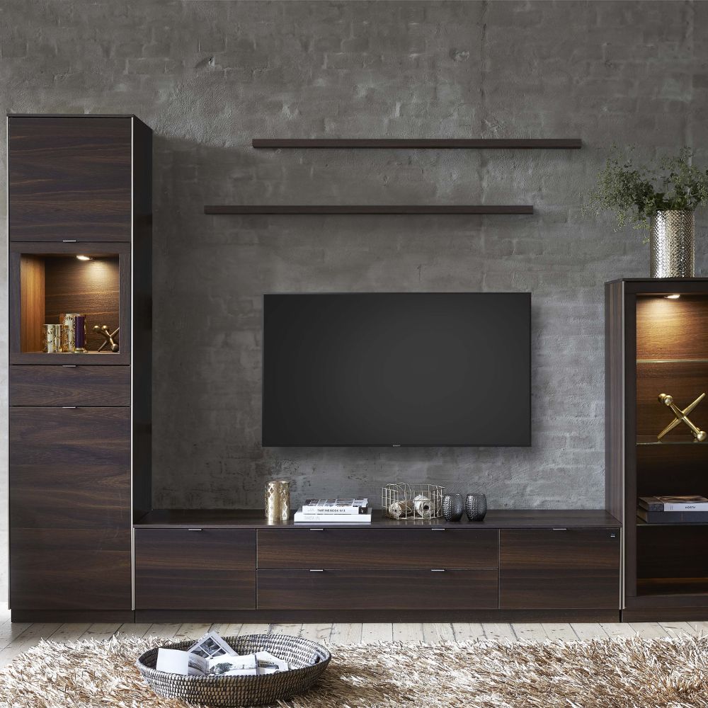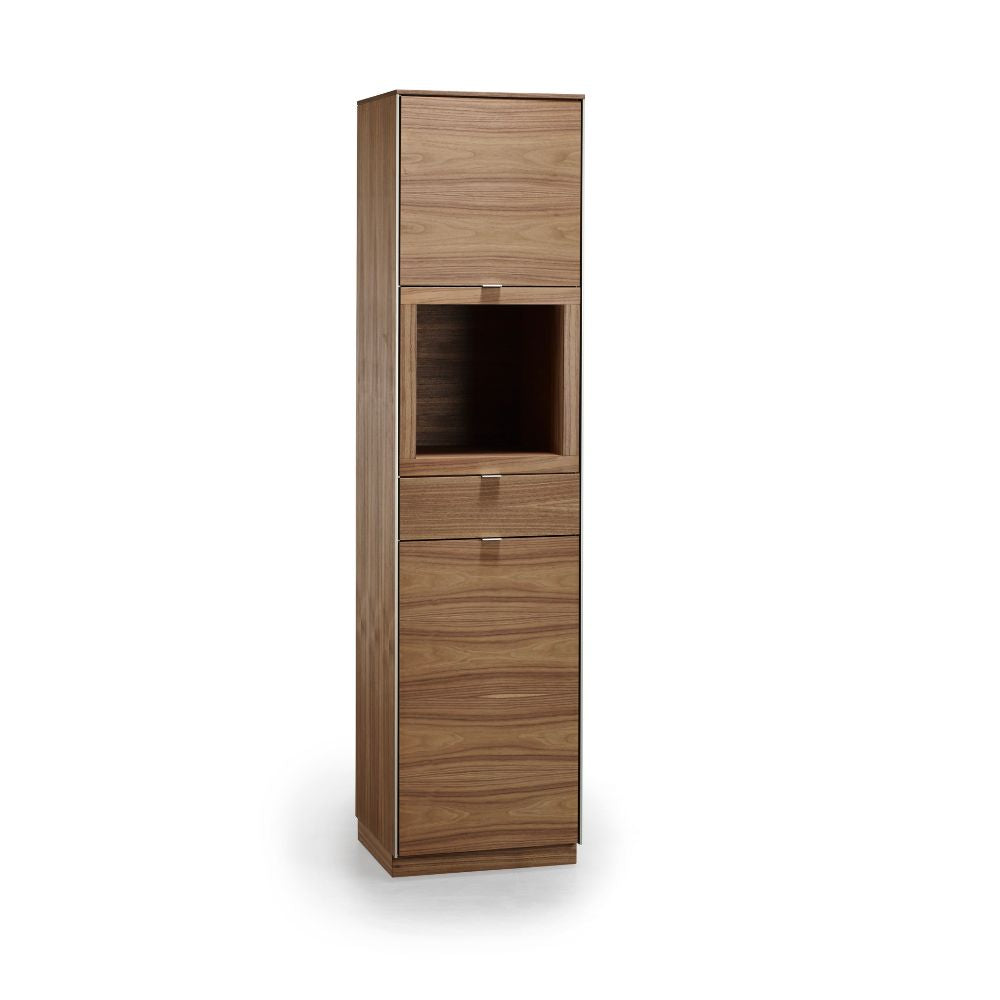- Trois étagères en bois derrière deux portes, un compartiment ouvert, un tiroir et une lumière LED .
