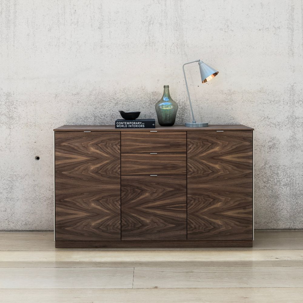 - Le buffet Skovby n° 932 est doté de quatre étagères en bois massif dissimulées derrière trois portes et deux tiroirs. Pratique et bien équipé, il se distingue par ses moulures latérales en aluminium et ses poignées en aluminium réalisées sur mesure. Son design géométrique apporte une touche de modernité à votre intérieur.