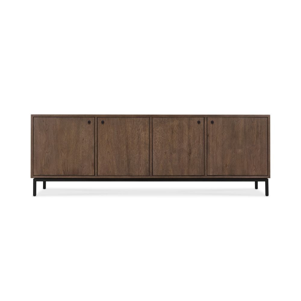 Le meuble TV bas Tutor allie style contemporain et fonctionnalité. Son profil bas et son élégant placage brun foncé lui confèrent une allure raffinée. Doté de quatre portes et d'étagères intérieures, il offre un espace de rangement généreux pour organiser vos essentiels de salon tout en préservant une esthétique épurée et moderne dans votre pièce à vivre.