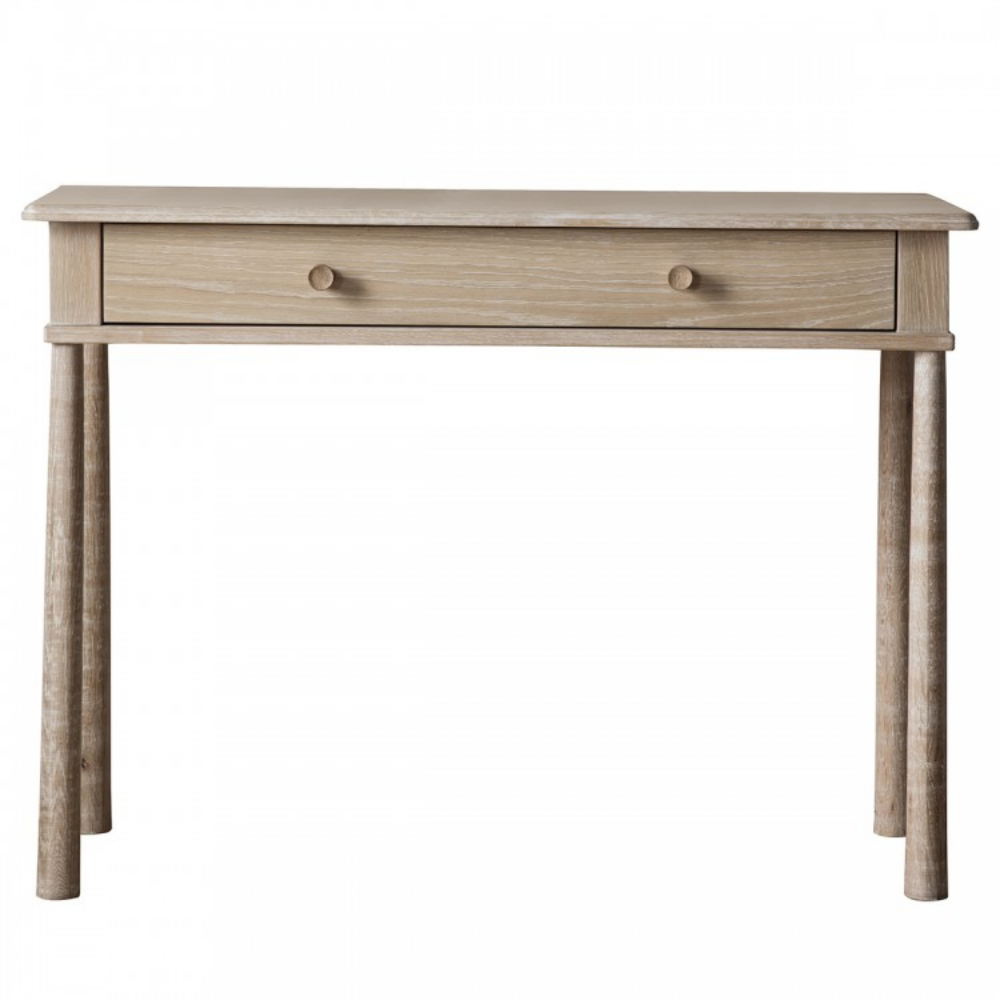 Fabriquée avec une structure traditionnelle en chêne massif très robuste, cette table se distingue par ses pieds élancés et son design contemporain. Reposant sur quatre pieds fuselés aux courbes douces, elle agrandit visuellement l'espace et laisse entrer la lumière naturelle. Son large plateau permet d'y poser un miroir et autres objets décoratifs. Recouverte d'une couche de laque protectrice contre l'usure quotidienne, cette table vous accompagnera pendant de nombreuses années.